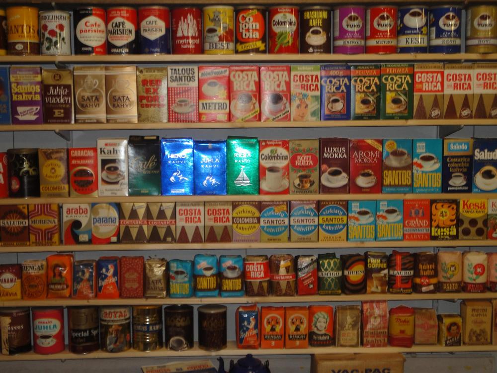 Kahvimuseossa ei tarvittu tapetteja, kun erilaisia kahvipaketteja oli seinät täynnä. Sekin oli ihan hauska kokemus.