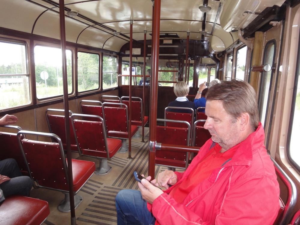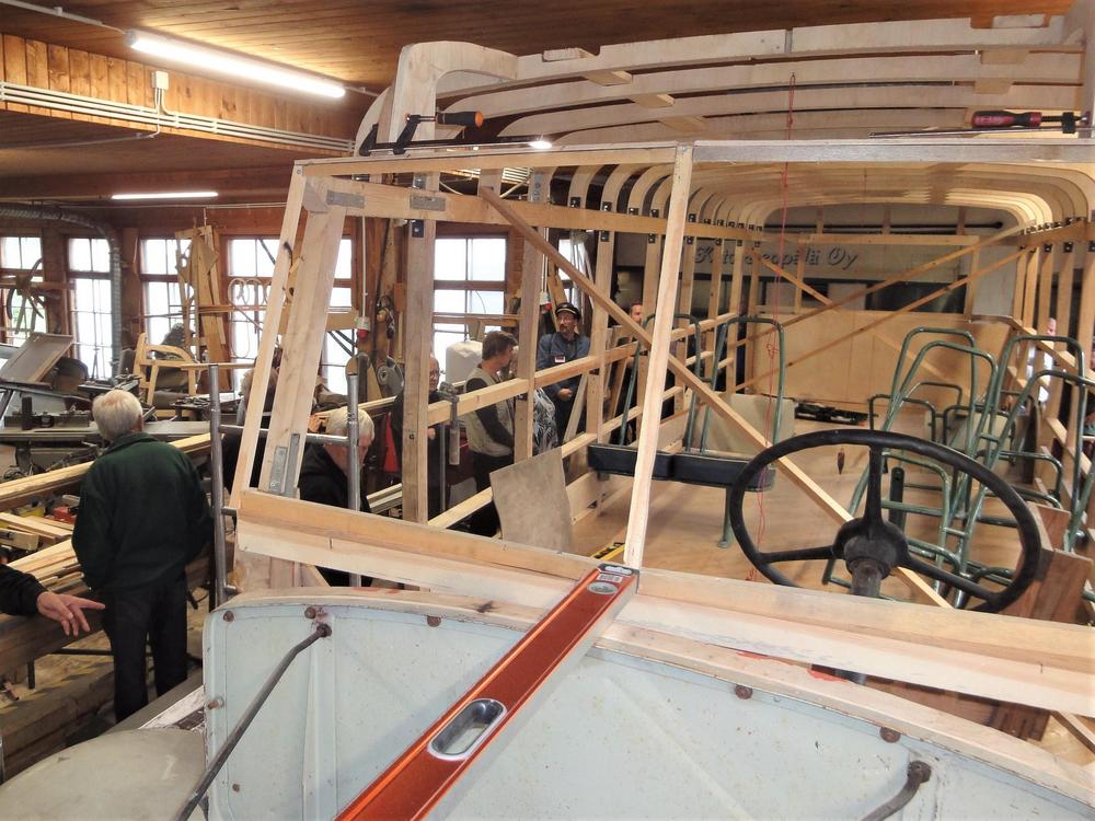 Meitä Tampereen mobilisteja oli noin 27 autokuntaa, jotka aloitimme retken Linja-automuseosta. Se on uskomattoman hieno paikka ja sen vastuuhenkilö Timo Lehtonen on aivan uskomaton asiantuntija. Yliopistomiehen tutkijan resursseilla on hän on etsinyt valtavan määrän tietoa alkuperäislähteistä ja osaa esittää sen mielenkiintoisesti. Samalla hän kokeilee entisessä Keto-Seppälän koritehtaassa, miten vanhoina aikoina bussin koreja rakennettiin. (Timo näkyy kuvassa, jos tarkkaan katsoo, korikehikon läpi auton takana.) Vuosittain olemme seuranneet, miten Sisun alustalle nousee uusi, mutta alkuperäisten piirustusten mukainen kori, osittain jopa vanhan tehtaan alkuperäisestä puumateriaalista. Työn edistyminen on hidasta, mutta varmaa. Melkein uskomatonta!