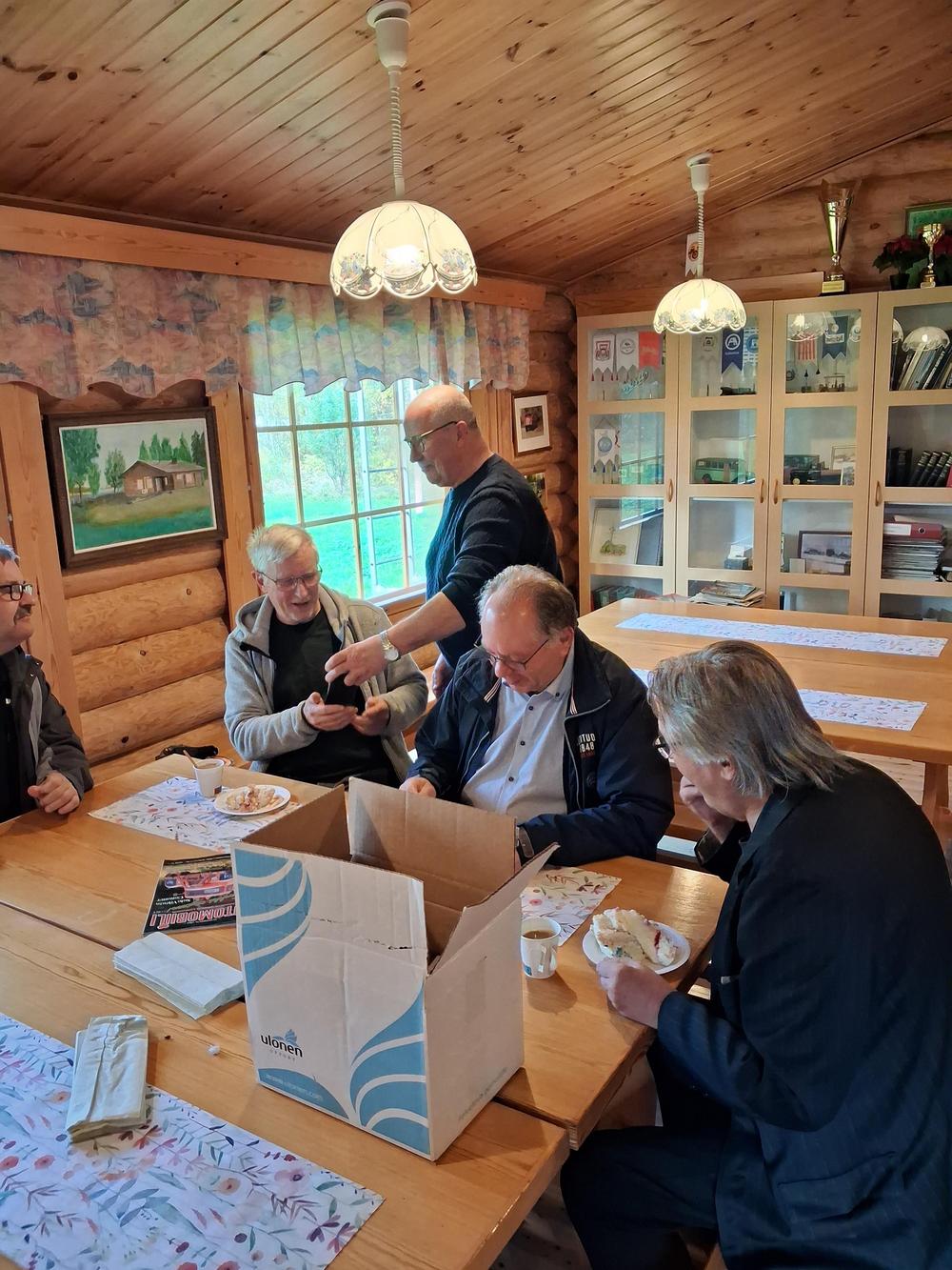 Kannattaa tulla käymään Restauranta-mökille. Aina voi sattua jonkun syntymäpäivä ja silloin syödään kakkua. Ja makkarakin kuuluu peruspalveluihin. Kuvassa Raimo esittelee valokuvia aamu-uinnilta.